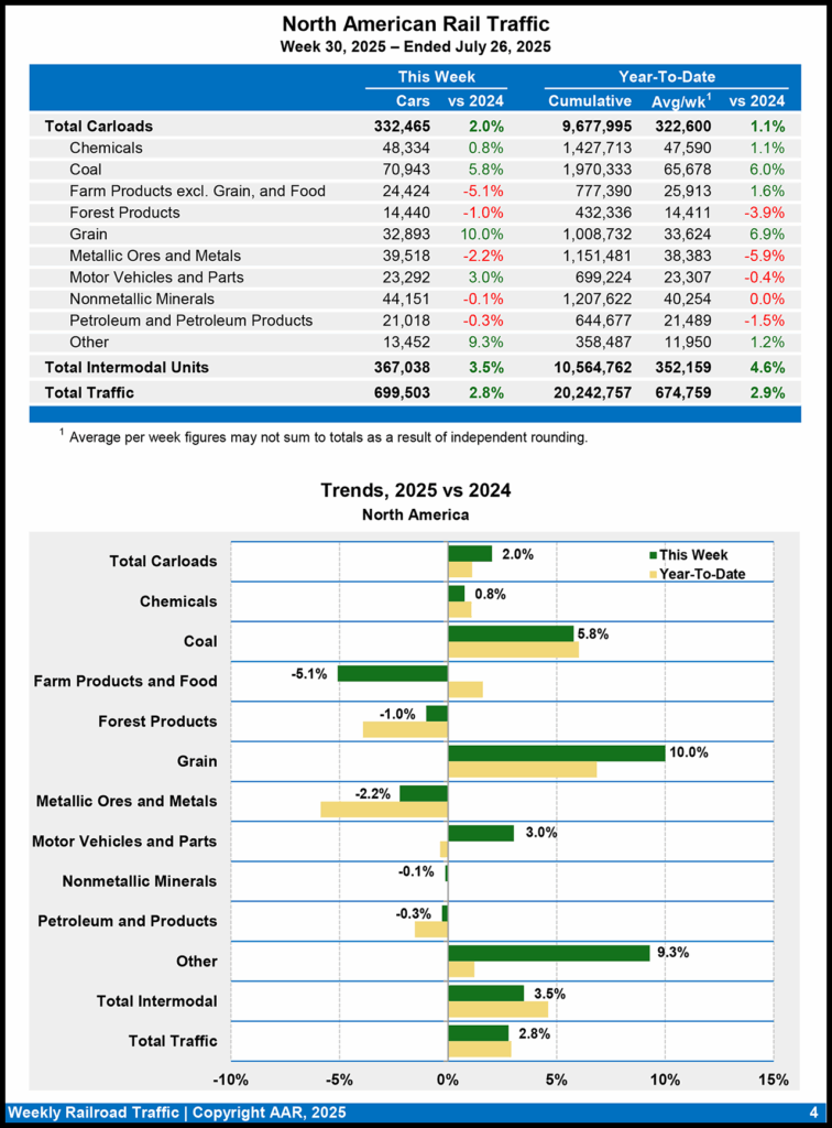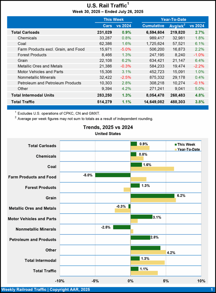 U.S. rail traffic for the week ending July 26, 2025 (Week 30) came in at 514,279 carloads and intermodal units, rising 1.1% from the same week last year, based on 231,029 carloads—up 0.9% from 2024—and intermodal volume of 283,250 containers and trailers—up 1.3% from 2024, the Association of American Railroads (AAR) reported July 30.