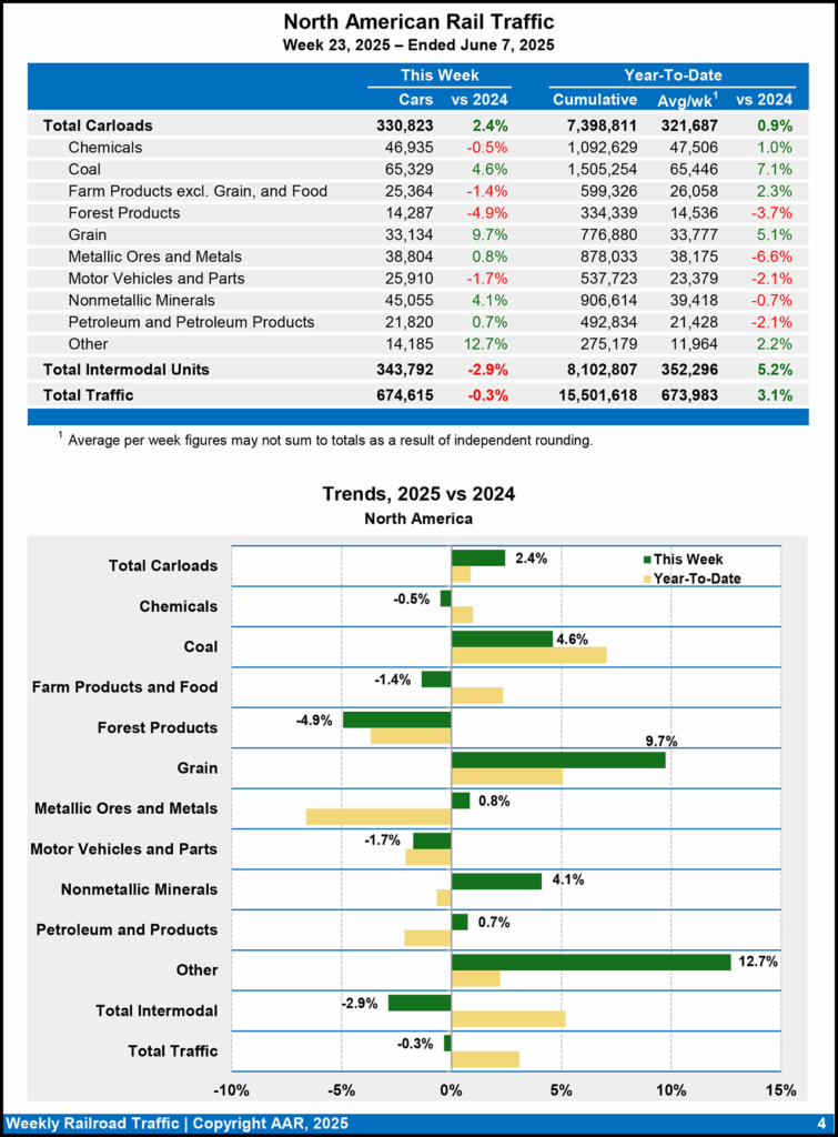 North American rail volume for the week ending June 7, 2025, on nine reporting U.S., Canadian, and Mexican railroads totaled 330,823 carloads, a 2.4% gain over the same week last year, and 343,792 intermodal units, a 2.9% drop-off from last year. Total combined weekly rail traffic in North America came in at 674,615 carloads and intermodal units, down 0.3%. North American rail volume for the first 23 weeks of this year was 15,501,618 carloads and intermodal units, up 3.1% compared with 2024.