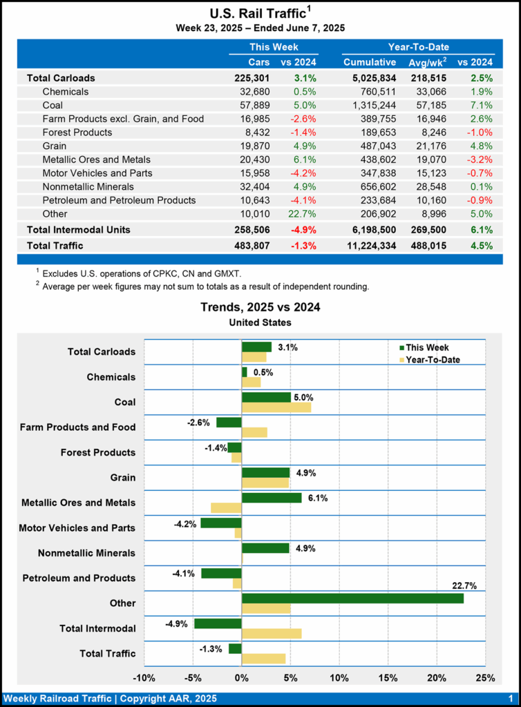 Six of the 10 carload commodity groups posted an increase for the week ending June 7, 2025, compared with the same week last year, the AAR reported June 11. They included coal, up 2,772 carloads, to 57,889; miscellaneous carloads, up 1,855 carloads, to 10,010; and nonmetallic minerals, up 1,503 carloads, to 32,404. Commodity groups that posted declines included motor vehicles and parts, down 701 carloads, to 15,958; petroleum and petroleum products, down 460 carloads, to 10,643; and farm products excluding grain, and food, down 452 carloads, to 16,985.