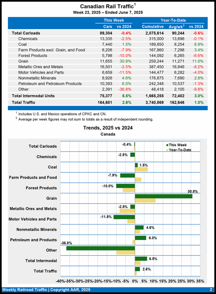 Canadian railroads reported 89,304 carloads for the week ending June 7, 2025, down 0.4%, and 75,377 intermodal units, up 6.5% compared with the same week last year. For the first 23 weeks of 2025, they reported cumulative rail traffic volume of 3,740,869 carloads, containers, and trailers, a 1.0% increase.