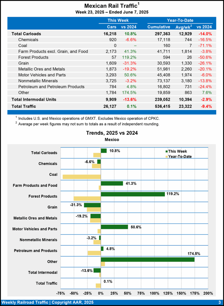 For the week ending June 7, 2025, Mexican railroads reported 16,218 carloads for the week, gaining 10.8% compared with the same week in 2024, and 9,909 intermodal units, decreasing 13.6%. Their cumulative volume for the first 23 weeks of this year was 536,415 carloads and intermodal containers and trailers, down 9.4% from the year-ago period.
