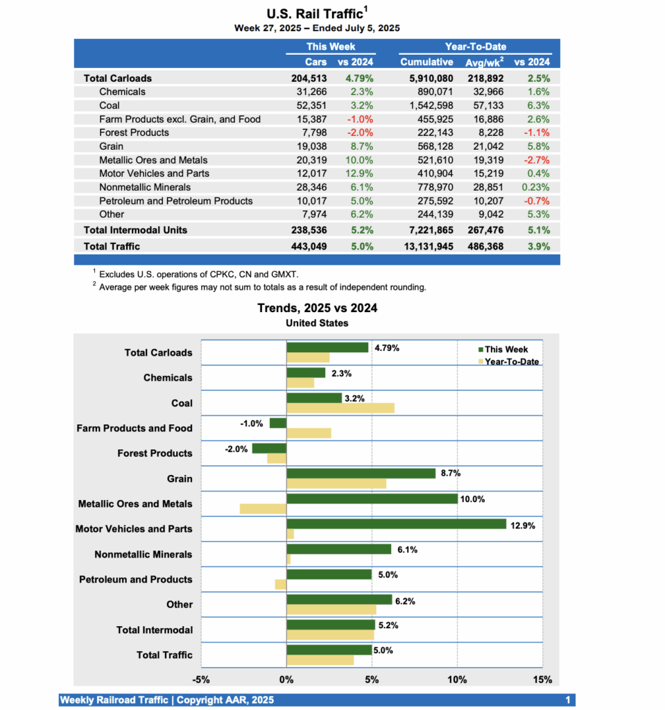 For the first 27 weeks of 2025, U.S. railroads reported cumulative volume of 5,910,080 carloads, up 2.5% from the same point last year; and 7,221,865 intermodal units, up 5.1% from 2024. Total combined U.S. traffic for the first 27 weeks of 2025 was 13,131,945 carloads and intermodal units, an increase of 3.9% percent compared to last year.