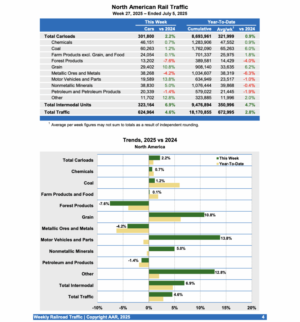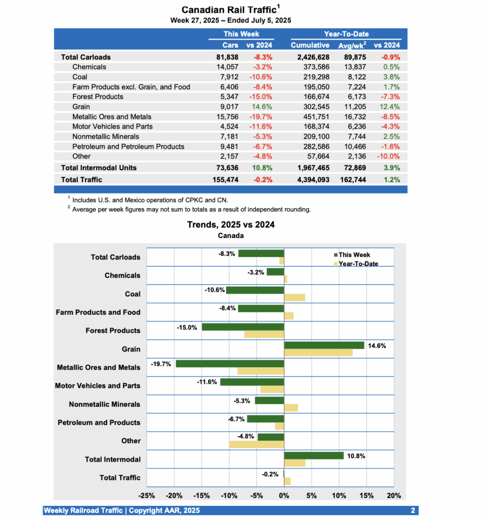 Fo the week ending July 5, 2025, Canadian railroads reported 81,838 carloads, dropping 8.3%, and 73,636 intermodal units, up 10.8% compared with the same week in 2024. For the first 27 weeks of 2025, Canadian railroads reported cumulative rail traffic volume of 4,394,093 carloads, containers and trailers, up 1.2%.