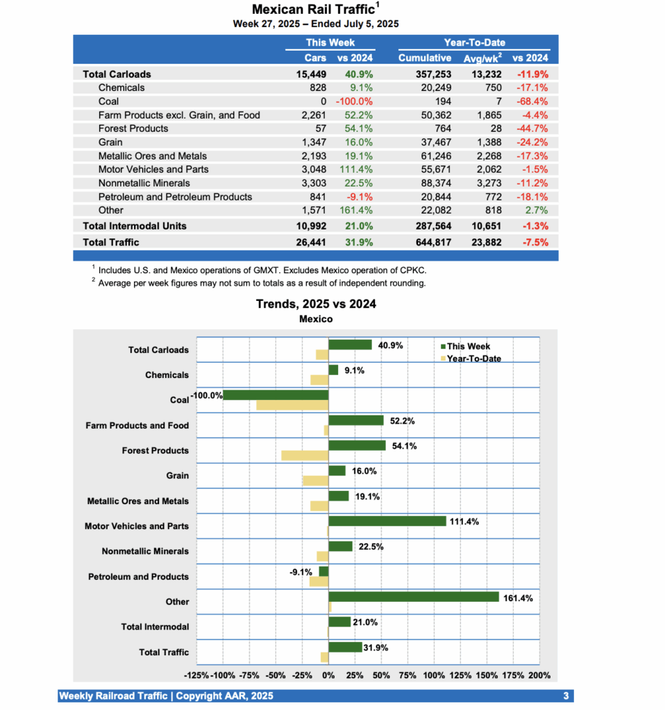 Mexican railroads reported 15,449 carloads for the week ending July 5, 2025, up 40.9% compared with the same week last year, and 10,992 intermodal units, up 21.0%. Cumulative volume on Mexican railroads for the first 27 weeks of 2025 was 644,817 carloads and intermodal containers and trailers, a 7.5% drop from the same point in 2024.