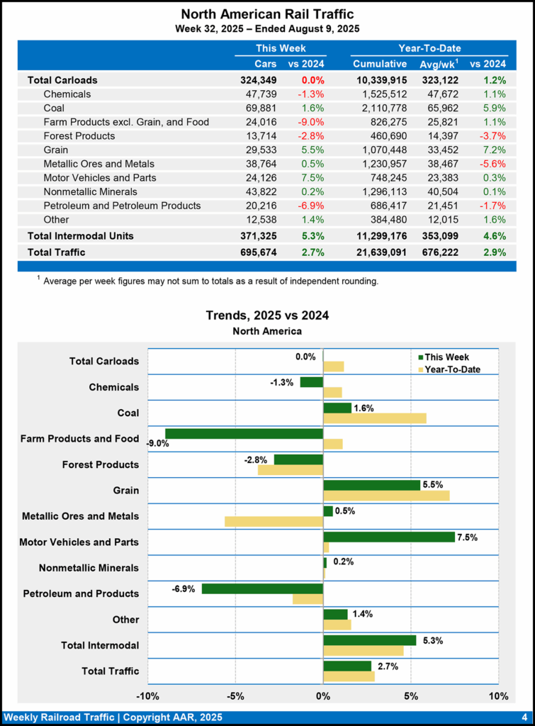 North American rail volume for the week ending Aug. 9, 2025, on nine reporting U.S., Canadian, and Mexican railroads totaled 324,349 carloads, down 0.04% from the same week last year, and 371,325 intermodal units, up 5.3% from last year. Total combined weekly rail traffic in North America was 695,674 carloads and intermodal units, up 2.7%. North American rail volume for the first 32 weeks of 2025 was 21,639,091 carloads and intermodal units, rising 2.9% from the same point last year.