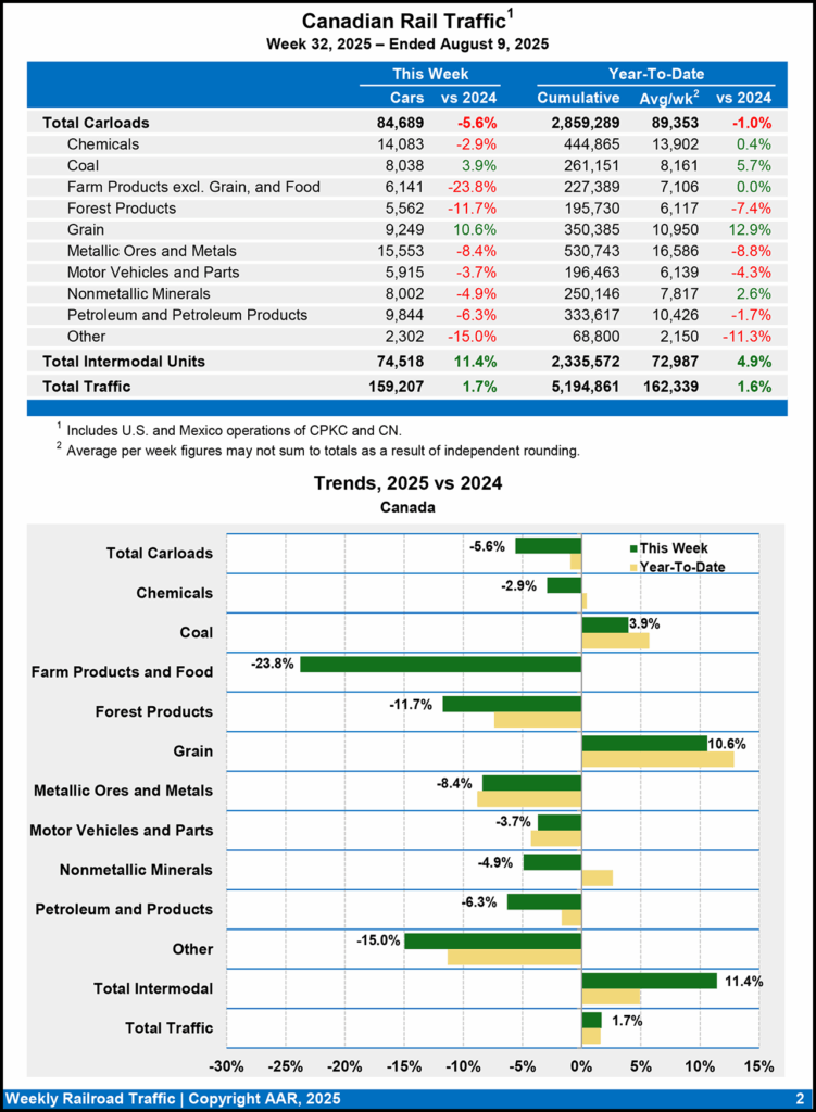 Canadian railroads reported 84,689 carloads for the week ending Aug. 9. 2025, down 5.6%, and 74,518 intermodal units, up 11.4% from the same week last year. For the first 32 weeks of this year, they reported cumulative rail traffic volume of 5,194,861 carloads, containers, and trailers, up 1.6%.