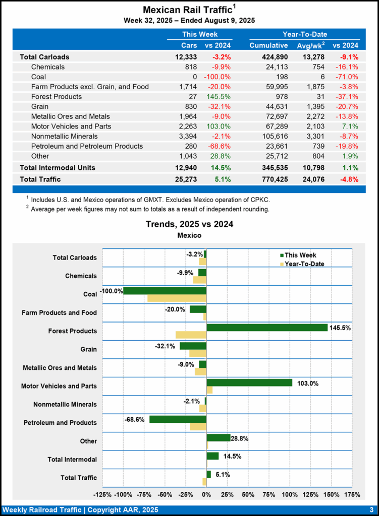 For the week ending Aug. 9, 2025, Mexican railroads reported 12,333 carloads, dipping 3.2% from the same point last year, and 12,940 intermodal units, rising 14.5%. Their cumulative volume for the first 32 weeks of 2025 came in at 770,425 carloads and intermodal containers and trailers, a 4.8% drop-off from the prior-year period.