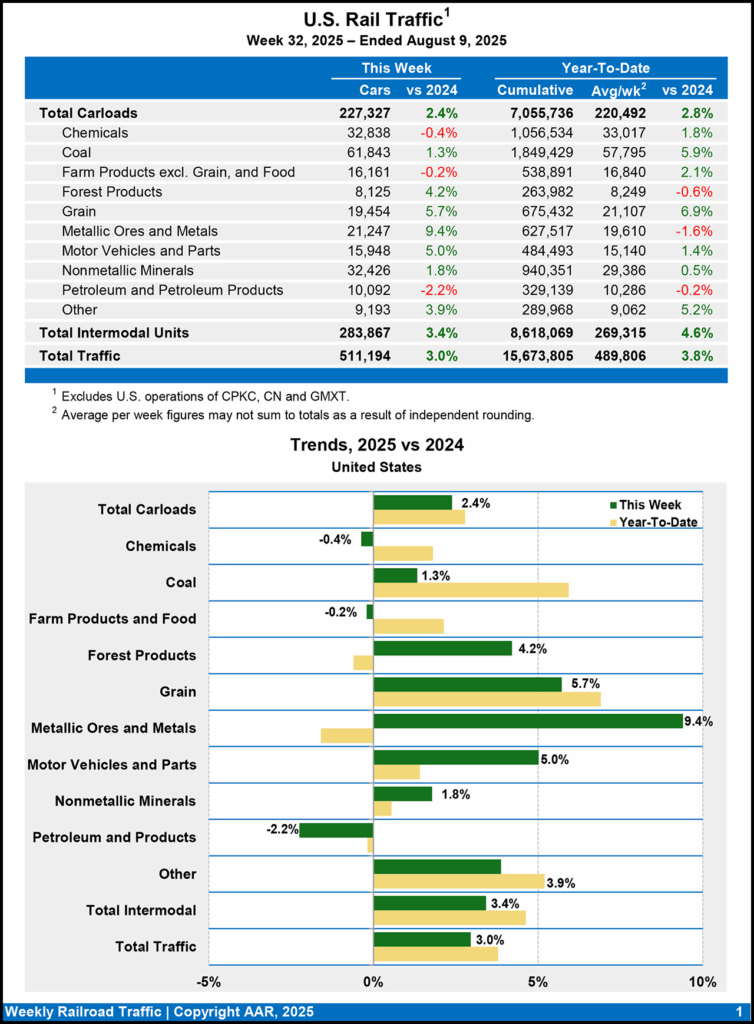 For the first 32 weeks of 2025, U.S. railroads reported cumulative volume of 7,055,736 carloads, a 2.8% gain over the year-ago period; and 8,618,069 intermodal units, a 4.6% increase from last year. Total combined U.S. traffic for the first 32 weeks of this year came in at 15,673,805 carloads and intermodal units, up 3.8% from 2024.