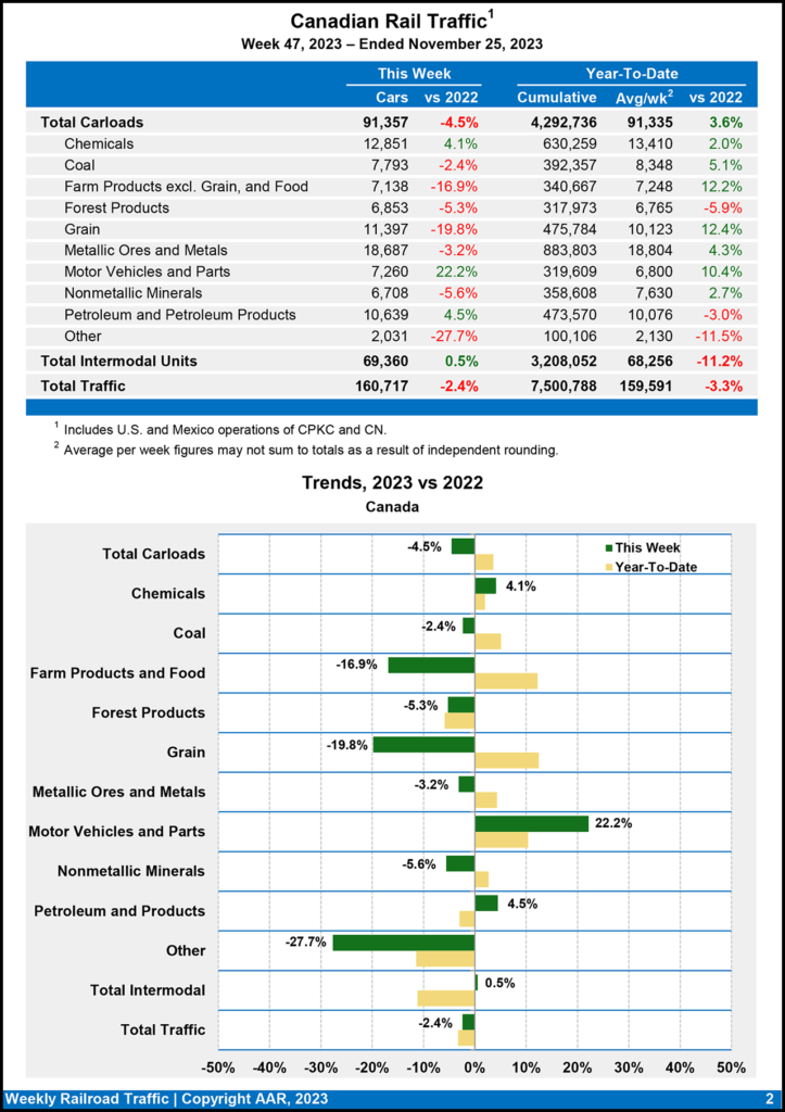 Canadian railroads reported 91,357 carloads for the week ending Nov. 25, 2023, a 4.5% drop-off, and 69,360 intermodal units, a 0.5% rise from the 2022 period. For the first 47 weeks of 2023, they reported cumulative rail traffic volume of 7,500,788 carloads, containers and trailers, down 3.3%.