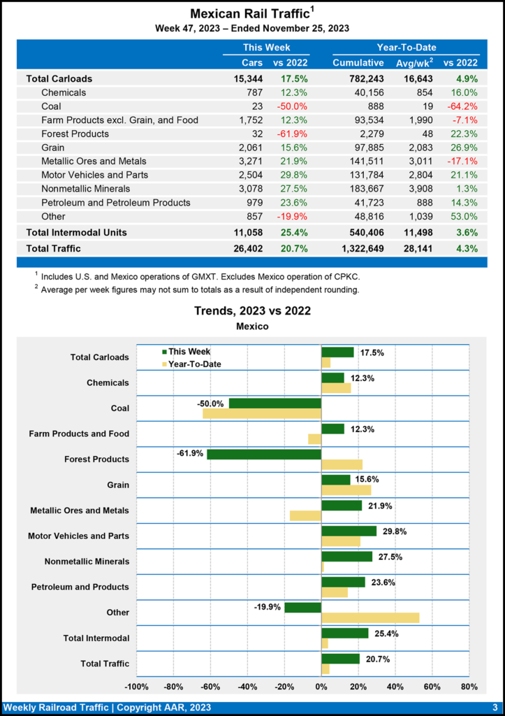 Mexican railroads reported 15,344 carloads for the week ending Nov. 25, 2023, a 17.5% gain from the same week last year, and 11,058 intermodal units, a 25.4% increase. Their cumulative volume for the first 47 weeks of this year was 1,322,649 carloads and intermodal containers and trailers, up 4.3% from the 2022 period.