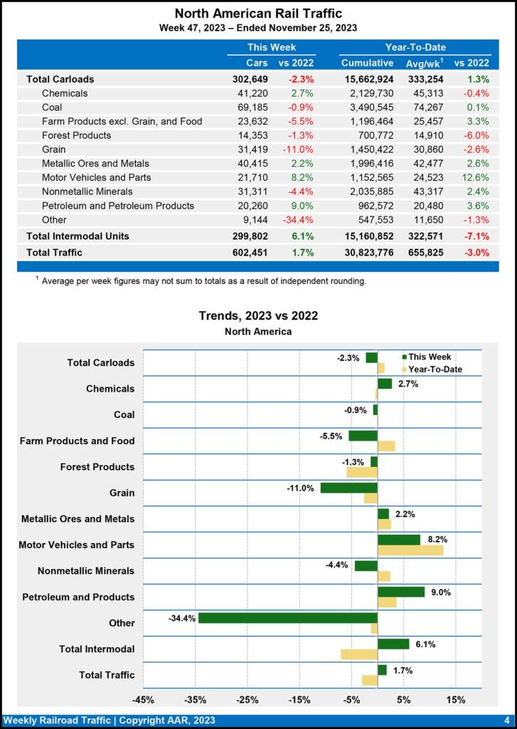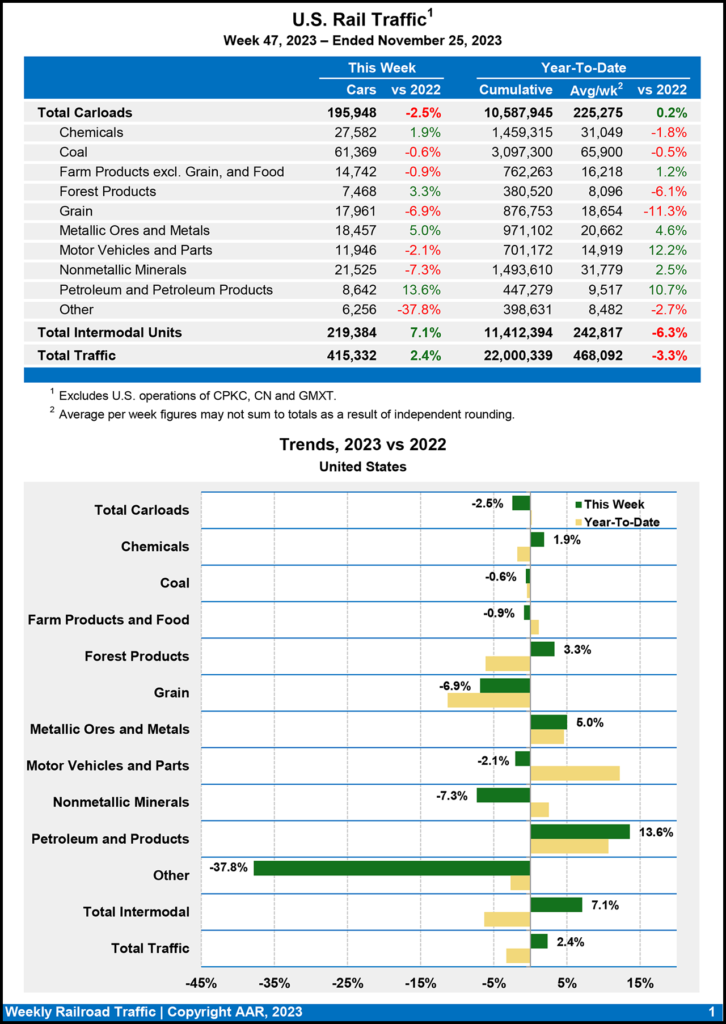 Total rail traffic for the week ending Nov. 25, 2023, comprised 195,948 carloads, down 2.5% from the same week last year, and 219,384 intermodal units, up 7.1% from 2022, according to the AAR.