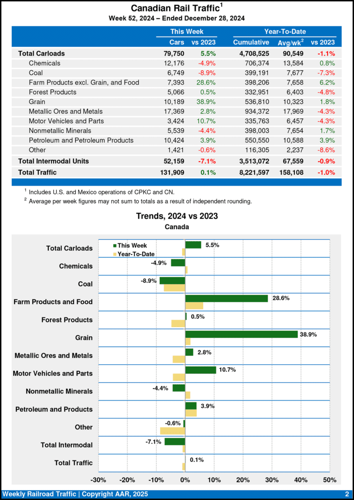 For the week ending Dec. 28, 2024, Canadian railroads reported 79,750 carloads, up 5.5%, and 52,159 intermodal units, down 7.1% from the same week in 2023.