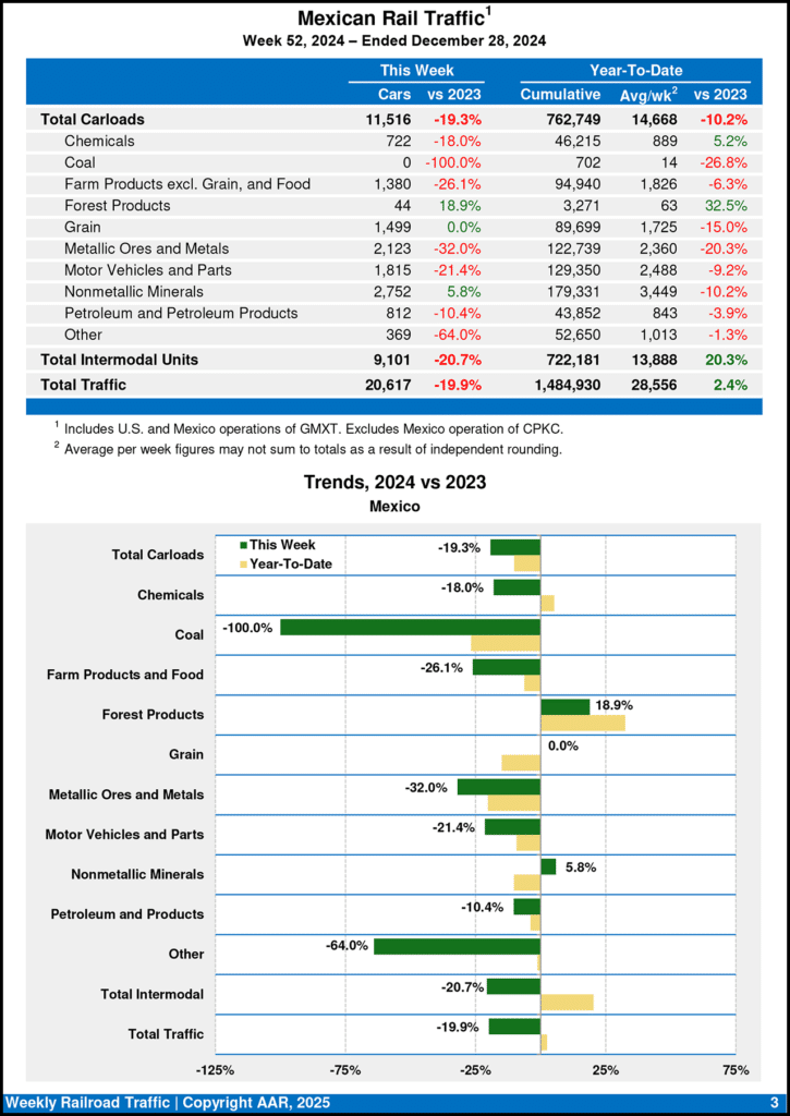 Mexican railroads reported 11,516 carloads for the week ending Dec. 28, 2024, dropping 19.3% from the same point in 2023, and 9,101 intermodal units, falling 20.7%.