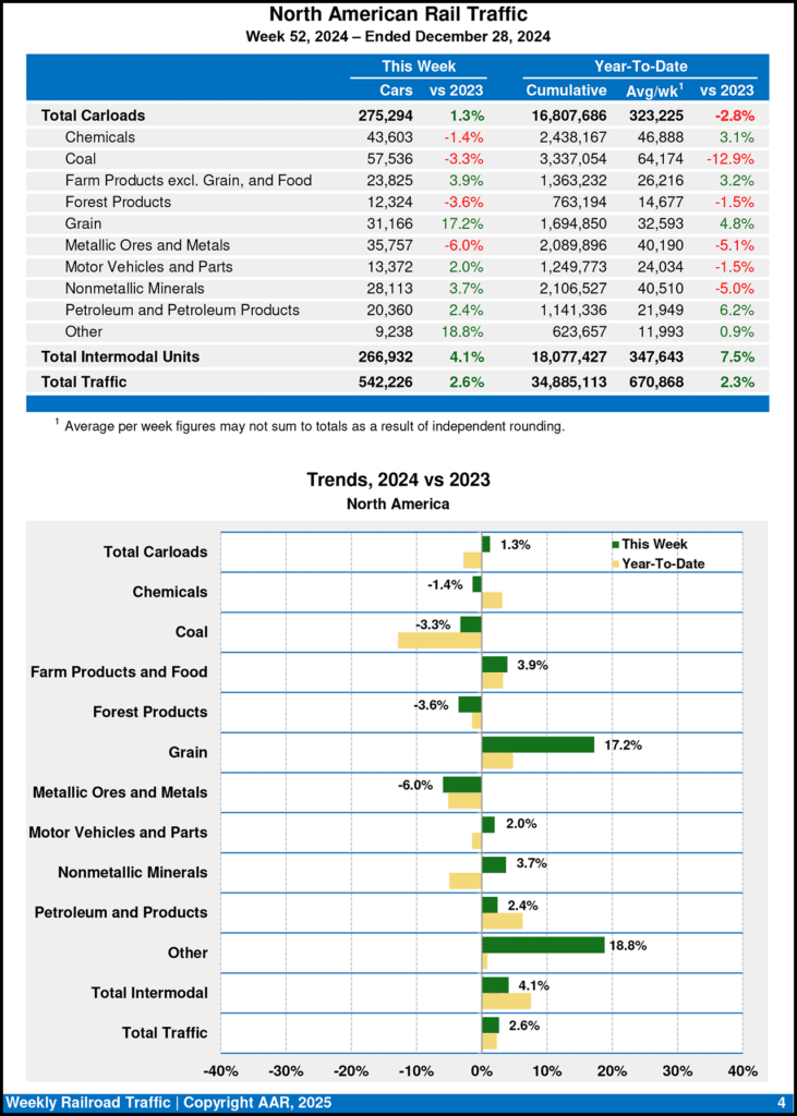 North American rail volume for the week ending Dec. 28, 2024, on nine reporting U.S., Canadian and Mexican railroads totaled 275,294 carloads, up 1.3% compared with the same week in 2023, and 266,932 intermodal units, up 4.1% compared with 2023. Total combined weekly rail traffic in North America was 542,226 carloads and intermodal units, up 2.6%.