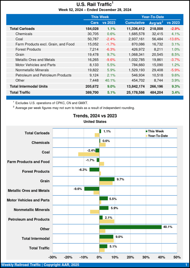 U.S. Class I railroads carried 389,700 carloads and intermodal units in the week ending Dec. 28, 2024, up 5.1% from the same week in 2023. This comprised 184,028 carloads, up 1.1% from 2023, and 205,672 containers and trailers, up 9.0% from 2023.