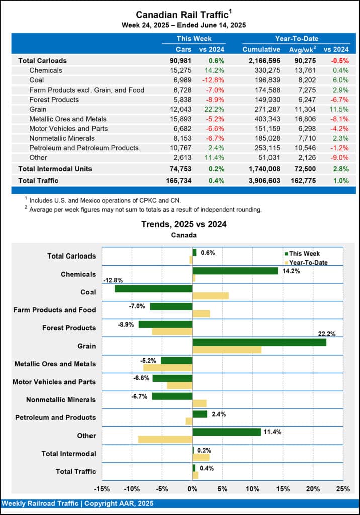Canadian railroads reported 90,981 carloads for the week, up 0.6%, and 74,753 intermodal units, up 0.2% compared with the same week in 2024. For the first 24 weeks of 2025, Canadian railroads reported cumulative rail traffic volume of 3,906,603 carloads, containers and trailers, up 1.0%. Mexican railroads reported 16,529 carloads for the week, up 0.9% compared with the same week last year, and 10,517 intermodal units, down 7.3%.