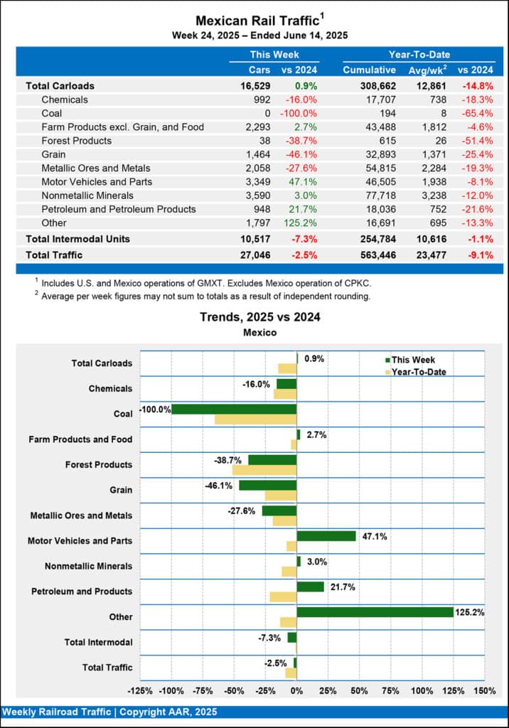 Cumulative volume on Mexican railroads for the first 24 weeks of 2025 was 563,446 carloads and intermodal containers and trailers, down 9.1% from the same point last year.