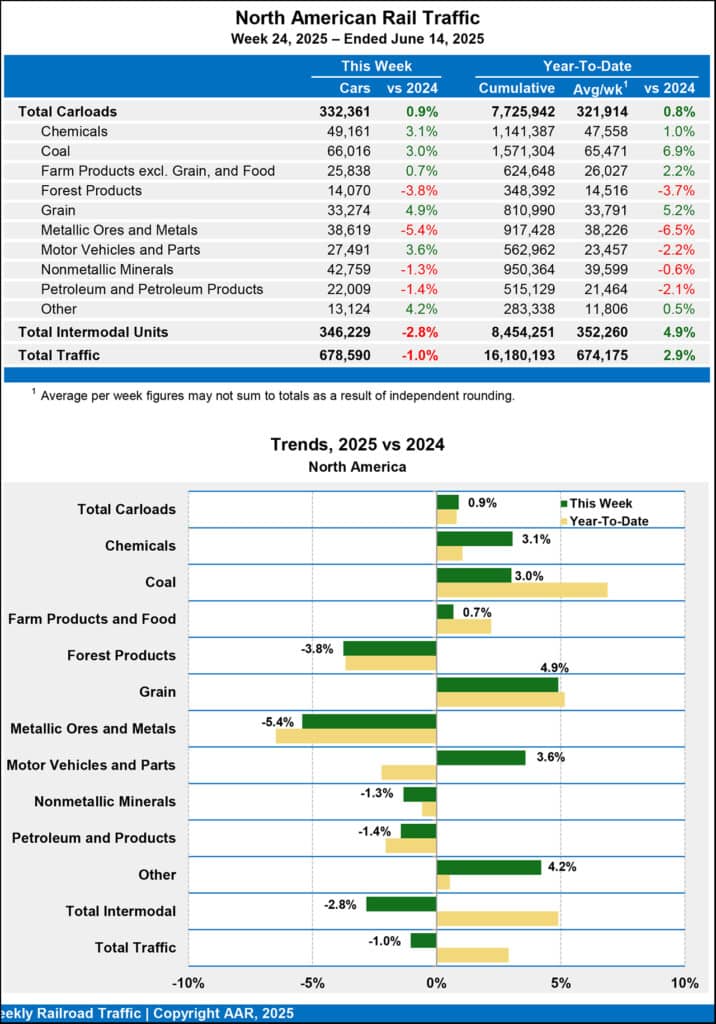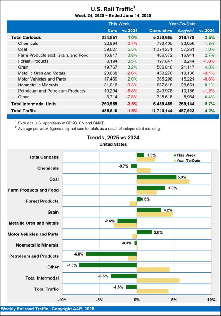 U.S. rail traffic for the week ending June 14, 2025 dipped slightly compared to the prior-year period but realized a modest gain through 2025’s first 24 weeks, the Association of American Railroads (AAR) reported June 18.