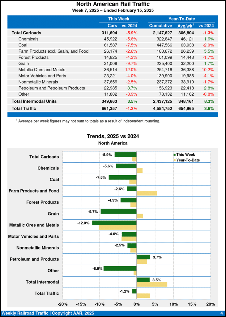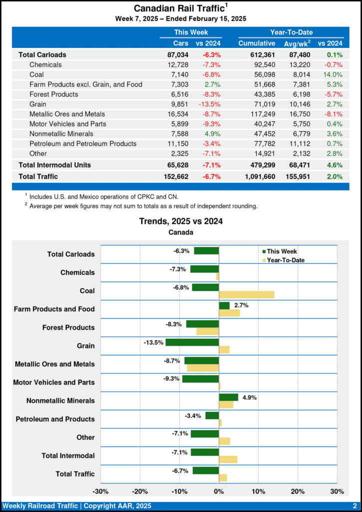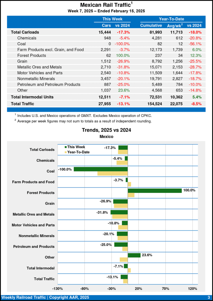 For the first seven weeks of 2025, cumulative rail traffic volume for Canadian railroads came in at 1,091,660 carloads, containers, and trailers, up 2.0% from the prior-year period, and for Mexican railroads, 154,524 carloads and intermodal containers and trailers, down 8.5% from 2024, the AAR reported Feb. 19.