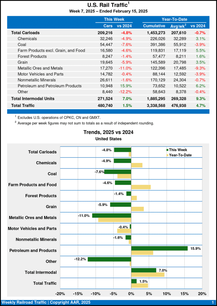 For the seven-week period ending Feb. 15, 2025, total U.S. rail traffic of 3,338,568 carloads and intermodal units was up 4.7% from same point last year, according to the Association of American Railroads (AAR). This is based on intermodal gains (up 9.3% to 1,885,295 units) compensating for carload losses (down 0.7% to 1,453,273 units).