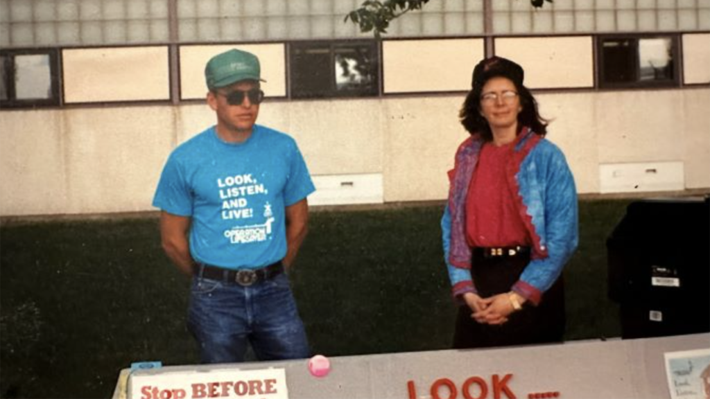 Dale Dannewitz volunteers with Locomotive Engineer Cheri Bonebrake at an Operation Lifesaver event circa 1994. (Caption and Photograph Courtesy of BNSF)