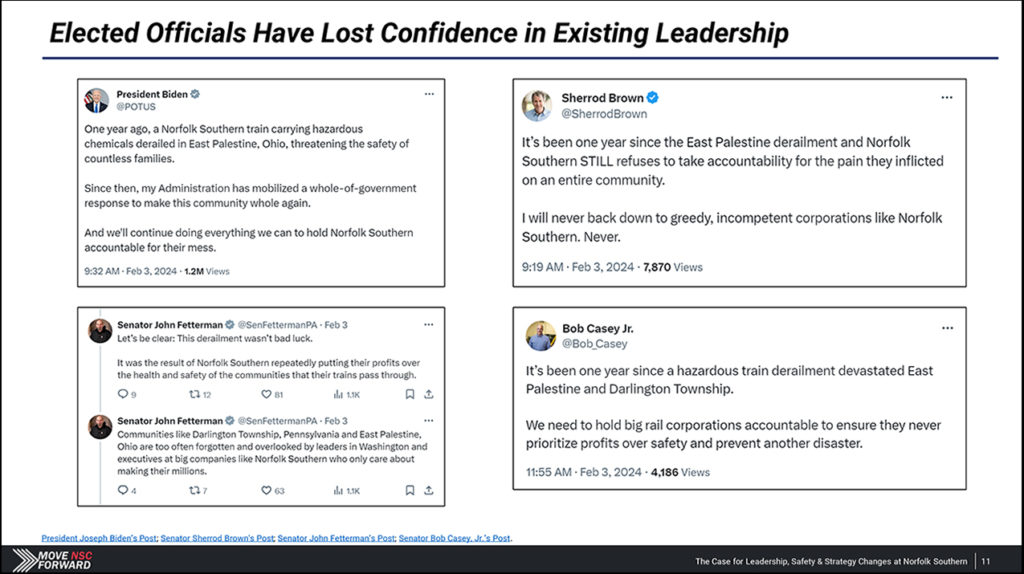 *Editor’s Comment: Calling NS’s response to East Palestine “tone-deaf” is ridiculous, unfair, unnecessary, thoroughly irresponsible and harmful to the railway industry. Leave it out of the discussion, unless you (Ancora) have what you think is a better response. The slide below from the “The Case for Leadership, Safety and Strategy Changes at Norfolk Southern” quoting social media posts from politicians promotes pure political horse manure. It’s meaningless, mean-spirited nonsense, borderline la bugia, la menzogna, le falsità. “I will never back down to greedy, incompetent corporations like Norfolk Southern,” tweeted U.S. Sen. Sherrod Brown. Really? Chiudi la bocca, senatore. Non hai idea di cosa stai parlando! – William C. Vantuono