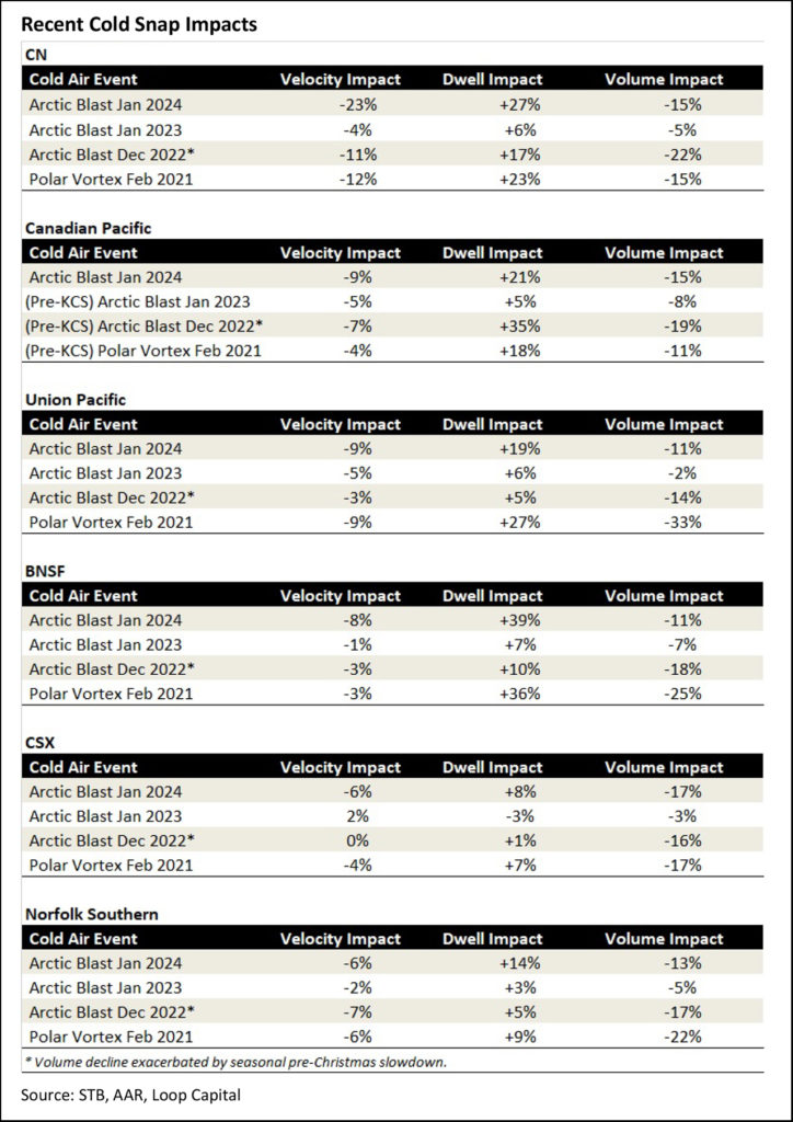CN took a bigger operational hit from the recent Arctic Blast than it did from the 2021 Polar Vortex, while both events had the same suppressive effect on volumes. CPKC was also hit harder, operationally, by the recent cold snap compared to the Polar Vortex, despite being more geographically exposed in 2021 because it of course pre-dated the KCS acquisition. CP struggled the most with the December 2022 Arctic Blast. BNSF similarly took a bigger operational punch this year compared to the last Polar Vortex, but the volume impact wasn’t as severe. Union Pacific wasn’t impacted as much as the 2021 Polar Vortex, but the recent cold snap still eclipsed the two Arctic Blasts from last winter. CSX saw a similar impact between the recent Arctic Blast and the 2021 Polar Vortex, while Norfolk Southern took a bigger operational hit from the 2024 Arctic Blast but less of a volume hit.