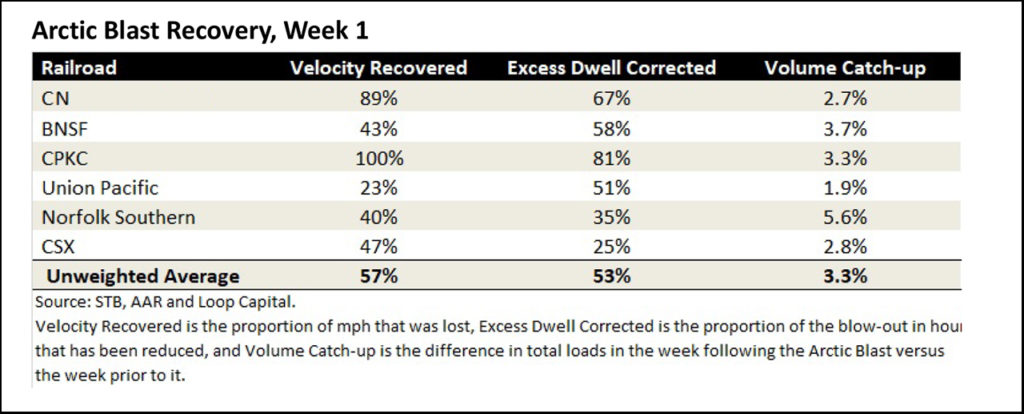 In terms of the recovery, a couple of weeks ago we expected good recoverability from the cold snap, and that’s what we’re seeing. Railroads only really get into trouble when an event like this compounds a problem that already exists (it’s the ‘2’ in a 1-2 punch). For example, had this cold snap occurred on the back of a few months of unanticipated volume growth that depleted crew capacity at some critical locations, some of the networks might have been vulnerable (à la 2014). We’ve of course had flat growth and an absence of volume pressure in recent times.