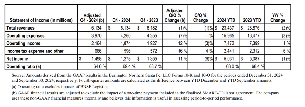In addition to the fourth quarter labor charge, full year results also included a significant charge related to a judgement in an ongoing legal case, which BNSF has appealed, the Class I noted. Including the impact of these items, operating income of $7.5 billion increased $73 million (1%) compared to 2023 and our operating ratio improved 0.4% to 68.0%.