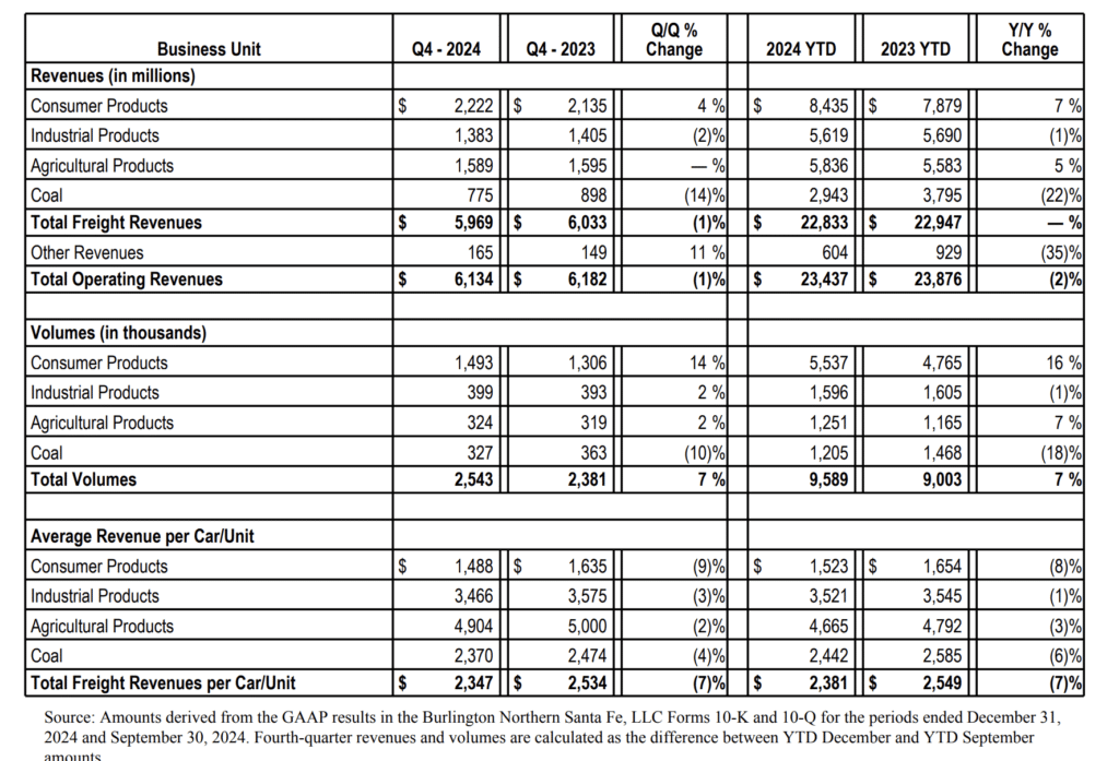- Consumer Products volumes increased 14% and 16%, respectively, for the fourth quarter and full year 2024 compared with the same periods in 2023. The volume increases were “primarily due to higher intermodal shipments from west coast imports and volumes from a new intermodal customer.”