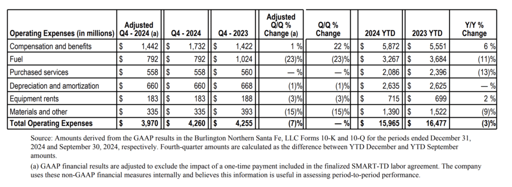 According to BNSF, operating expenses increased slightly for the fourth quarter and decreased 3% for the full year 2024 compared with the same periods in 2024. A significant portion of the changes were due to the following factors: