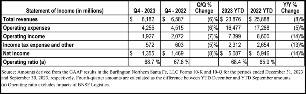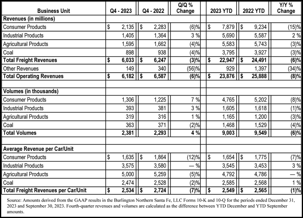 For 2023, BNSF posted net earnings of $5.087 billion, down 14% from the prior-year period; revenues of $23.876 billion, down 8% from 2022; and total volumes (in thousands) of 9,003, down 6% from 2022’s 9,549.
