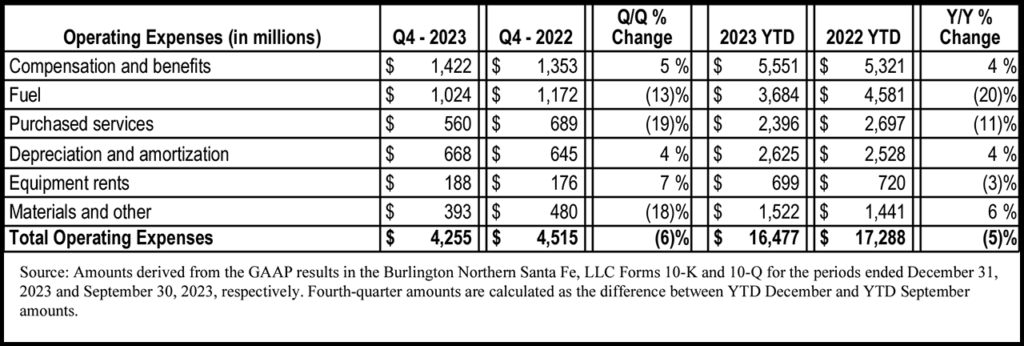 BNSF’s operating expenses for fourth-quarter and full-year 2023 came in at $4.255 billion—down 6% from the prior-year period’s $4.515 billion—and $16.477 billion—down 5% from 2022’s $17.288 billion—respectively. The railroad attributed a “significant portion” of the decline to: