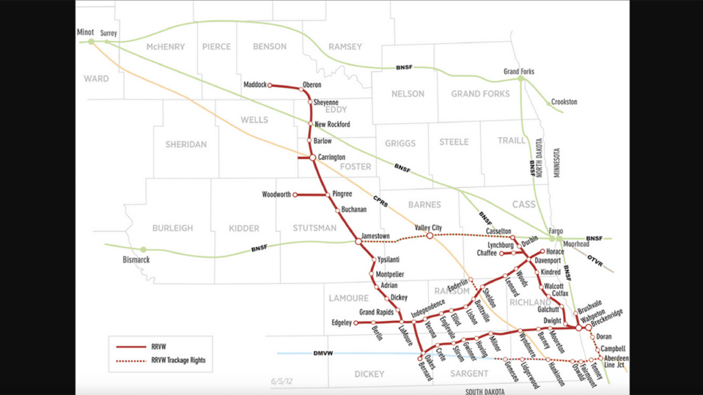 Red River Valley & Western Railroad (RRVW), Railway Age’s 1997 Regional Railroad of the Year, is the newest program participant, BNSF reported via social media on April 4. RRVW operates more than 500 miles of track, primarily in the southeast quarter of North Dakota and as far north as Maddock, N.Dak. (see map below). It serves more than 70 customers, including 13 grain shuttle facilities, 33 grain elevators, and a number of processors.