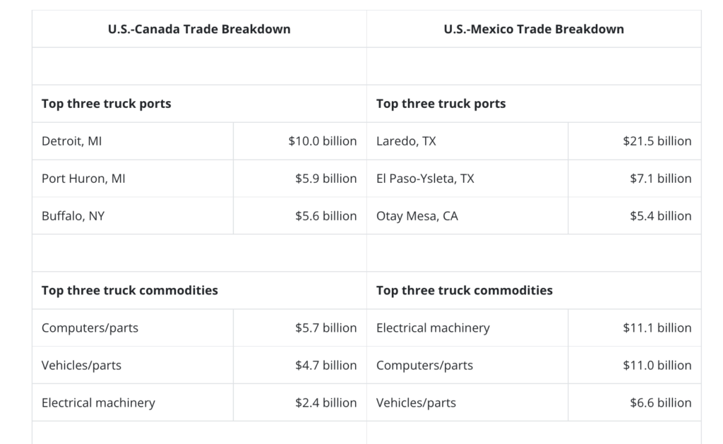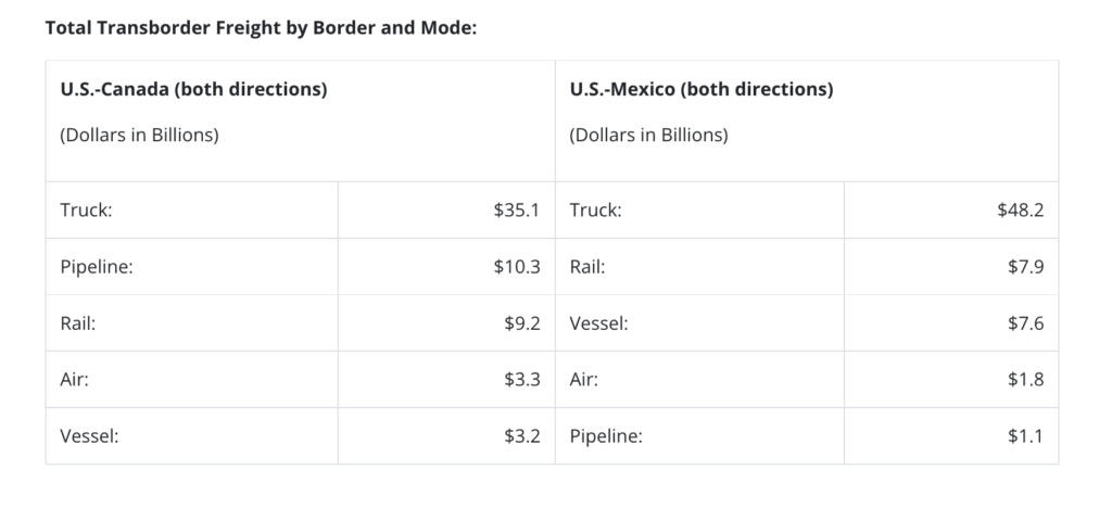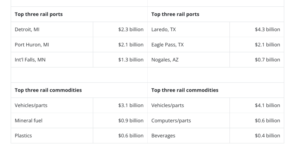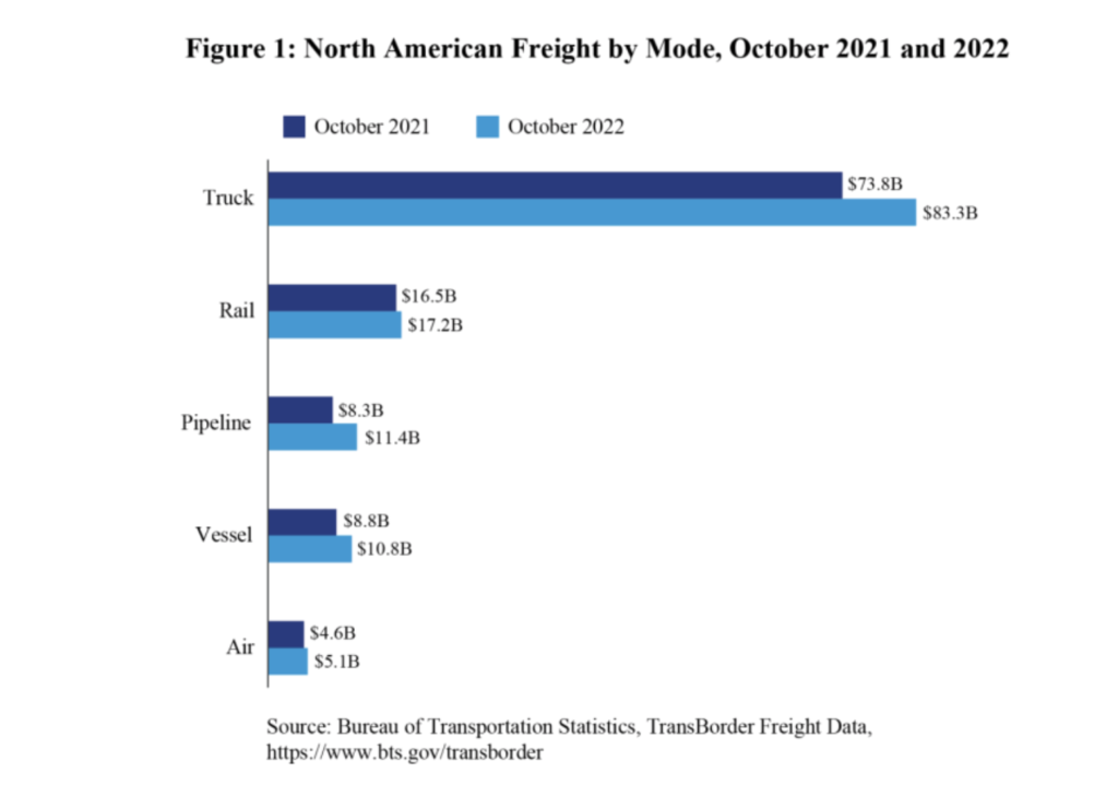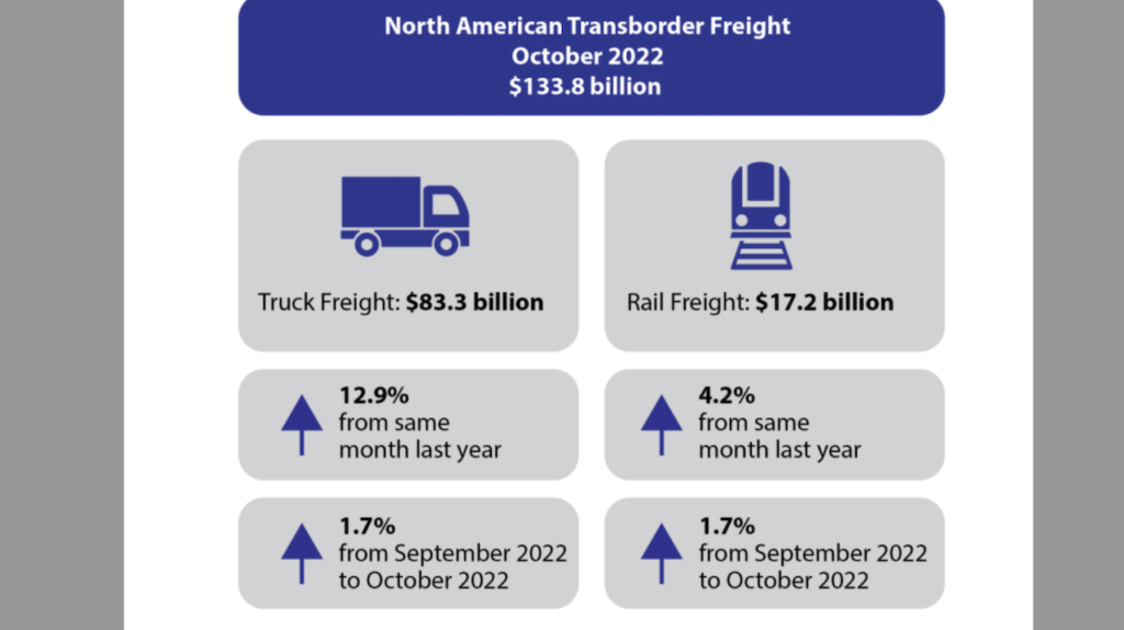 According to BTS, freight between the U.S. and Canada in October 2022 totaled $65.4 billion, up 11.6% from October 2021, with rail making up $9.2 billion of the total freight moved. Freight between the U.S. and Mexico totaled $68.4 billion, up 16.2% from October 2022, with rail making up $7.9 billion of the total.