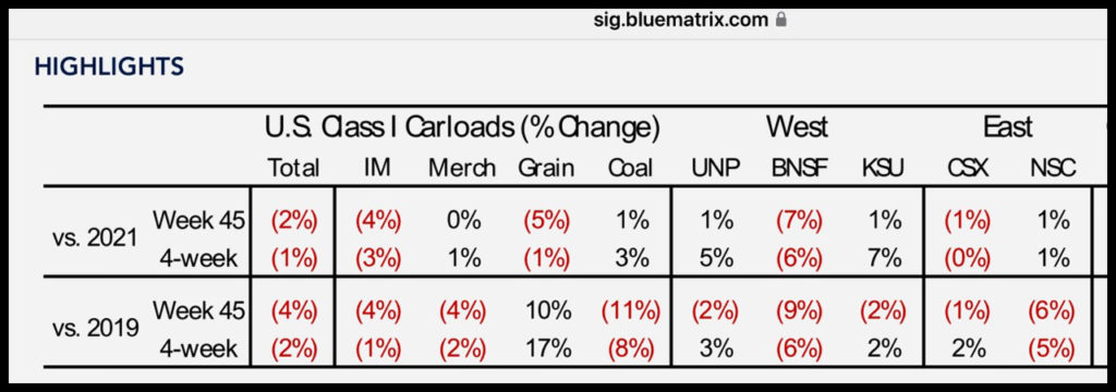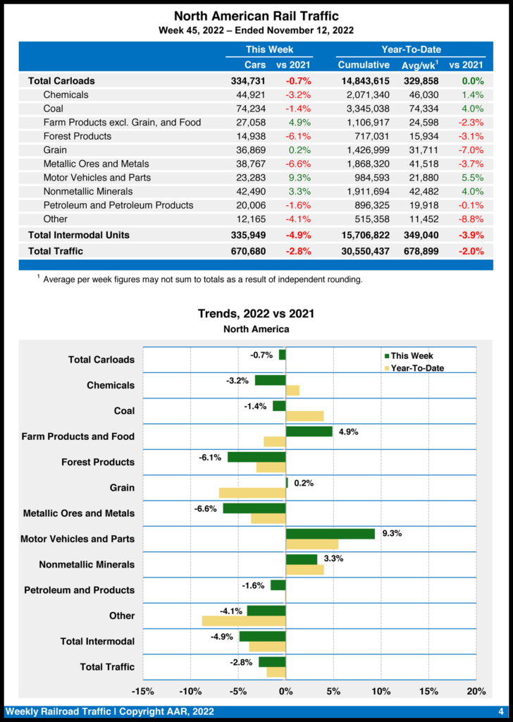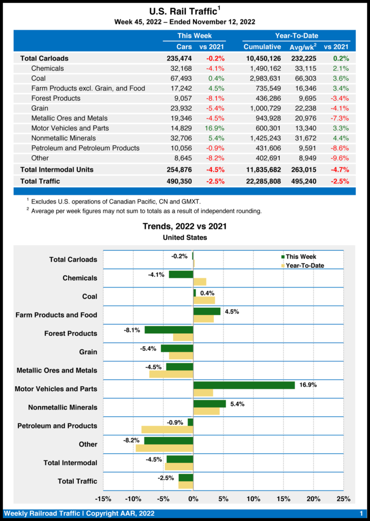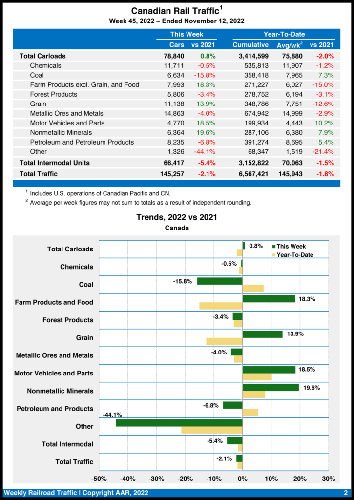 Canadian railroads reported 78,840 carloads for the week ending Nov. 12, 2022, up 0.8%, and 66,417 intermodal units, down 5.4% vs. the same week in 2021. For the first 45 weeks of 2022, they reported cumulative rail traffic volume of 6,567,421 carloads, containers and trailers, a 1.8% decrease from last year.