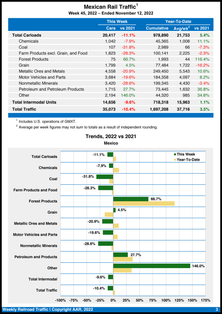 Mexican railroads reported 20,417 carloads for the week ending Nov. 12, 2022, dropping 11.1% from the same week last year, and 14,656 intermodal units, falling 9.6%. Their cumulative volume for the first 45 weeks of 2022 was 1,697,208 carloads and intermodal containers and trailers, a 3.5% gain over 2021.