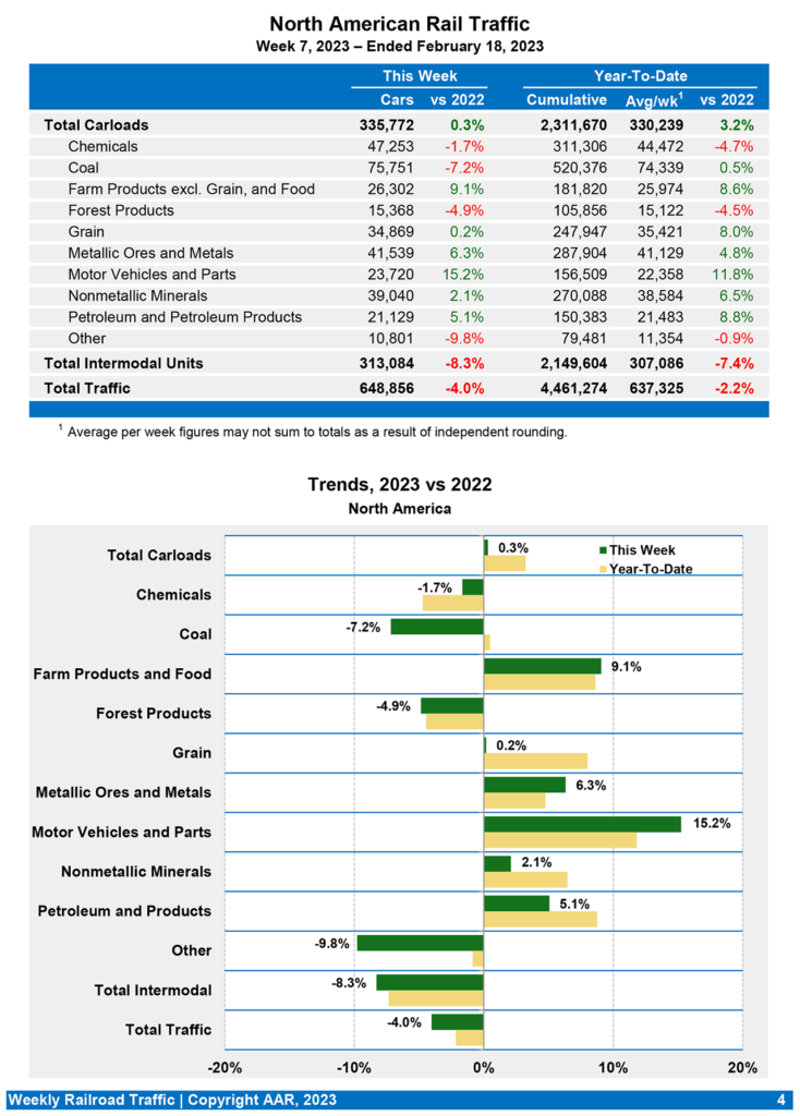 North American rail volume for the week ending Feb. 18, 2023, on 12 reporting U.S., Canadian and Mexican railroads totaled 335,772 carloads, up 0.3% from the same week in 2022, and 313,084 intermodal units, down 8.3% from last year. Total combined weekly rail traffic in North America was 648,856 carloads and intermodal units, a 4.0% decrease. North American rail volume for the first seven weeks of 2023 was 4,461,274 carloads and intermodal units, a 2.2% drop-off from last year.