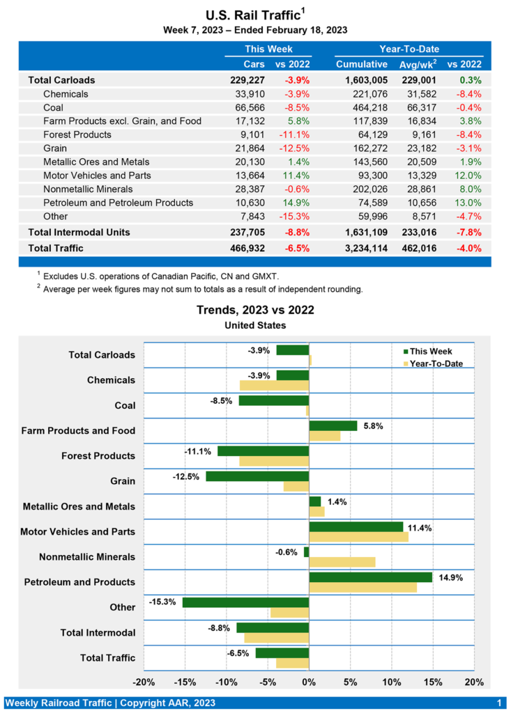 For the first seven weeks of 2023, U.S. railroads reported cumulative volume of 1,603,005 carloads, up 0.3% from the prior-year period; and 1,631,109 intermodal units, down 7.8% from the same point last year. Total combined U.S. traffic for the first seven weeks of 2023 came in at 3,234,114 carloads and intermodal units, a 4.0% drop-off from 2022.