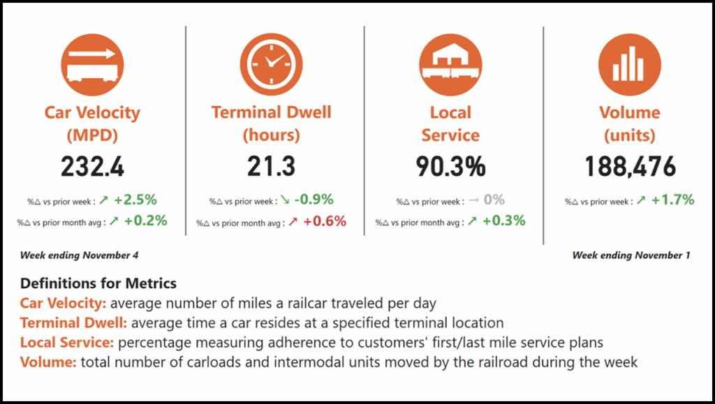 “BNSF operating teams are sustaining improved service performance as we move through the first week of November,” the Class I railroad reported Nov. 7. “Car velocity has increased compared to the previous week and is steady with the average for the month of October. Average terminal dwell remains consistent with that of the previous week and month, and our local service compliance measure exceeds 90%.”