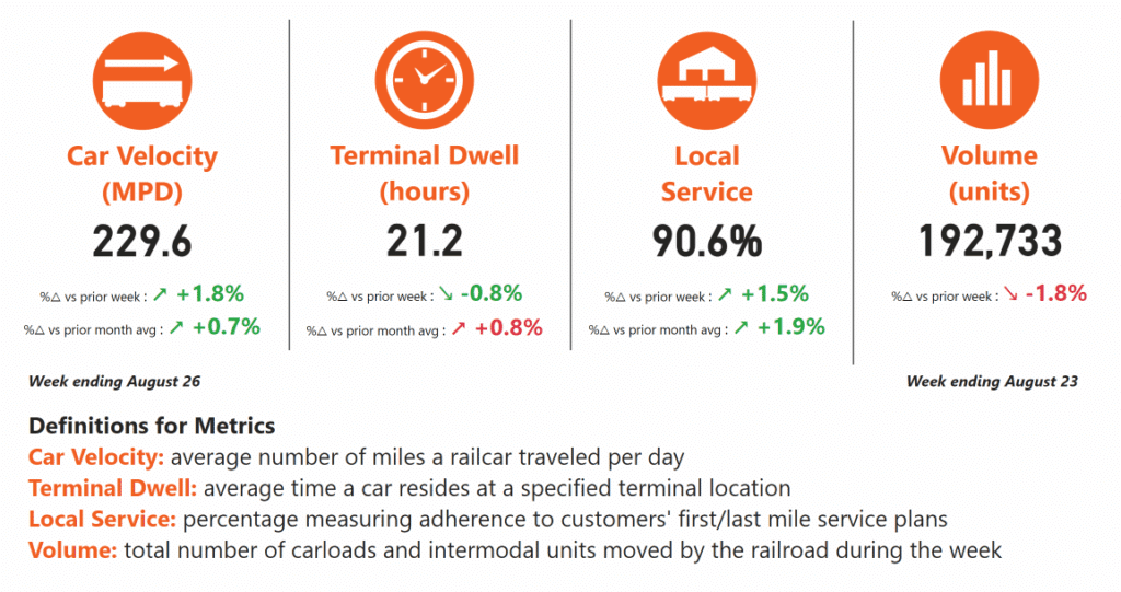 “BNSF operating teams are generating improved performance and building on the positive momentum going into the holiday weekend,” the Class I railroad told customers in an Aug. 29 online message. Average car velocity increased nearly 2% versus the prior week. Terminal dwell remains steady as compared to the prior week’s average and levels in July. “Our local service compliance measure, which reflects our timeliness in handling carload freight, is above 90% and improved compared to both the previous week and the prior month,” BNSF said.