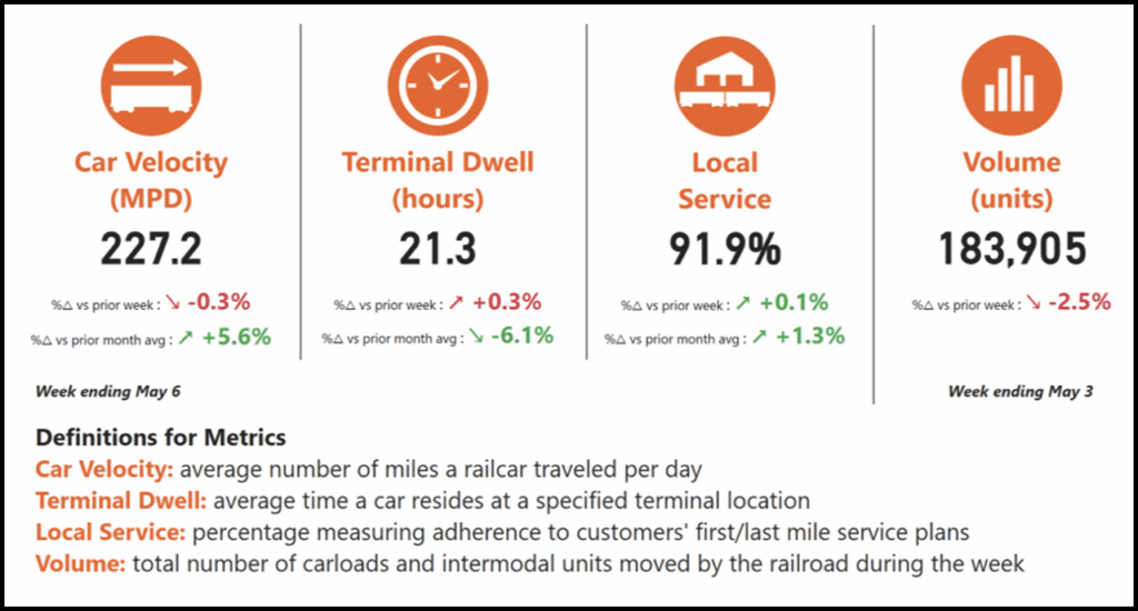 “The network is in solid condition, and BNSF operating teams are positioned to build on the positive momentum as we move deeper into May,” the Class I railroad told customers in a May 9 online message. Average car velocity and terminal dwell times have remained stable, it noted, compared with the previous week and have shown “significant improvement” since April. Additionally, BNSF’s local service compliance measure, which indicates its efficiency in handling carload freight, is trending at nearly 92%, according to the railroad.