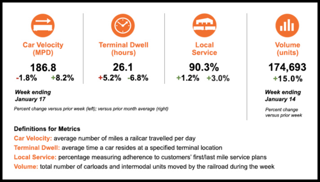 Following weather-related service challenges at the end of December, BNSF reports that overall car velocity for the week ending Jan. 17 is up more than 8% vs. last month. Also, Canadian Pacific (CP) readies the Empress, its 1930-vintage steam locomotive, for a special cross-continental voyage from Calgary to Mexico City to celebrate completion of the proposed CP-Kansas City Southern merger, pending regulatory approval; and Norfolk Southern (NS) hosts its inaugural Thoroughbred Sustainability Award winners in Atlanta, Ga.