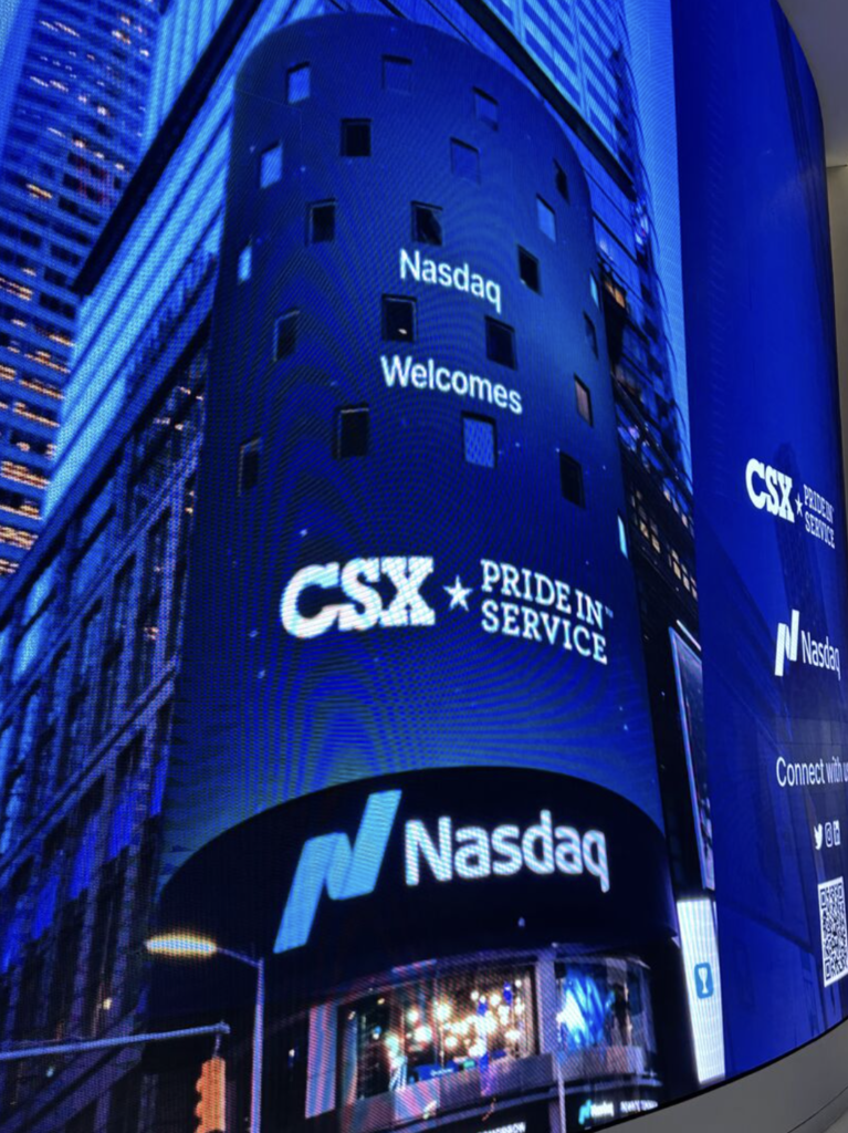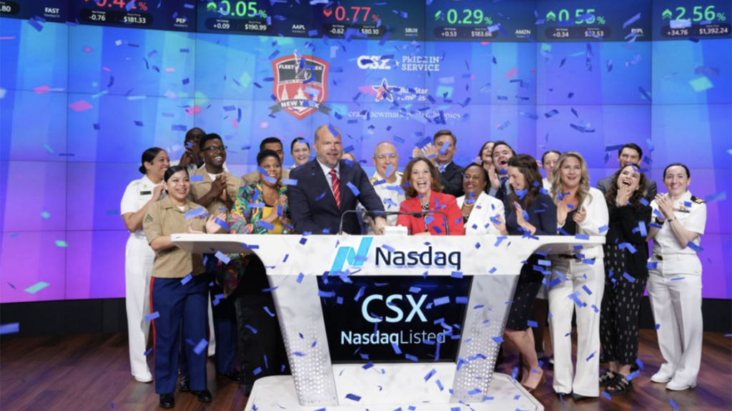 CSX on May 23 visited the Nasdaq MarketSite in New York City’s Times Square with Blue Star Families, a chapter-based non-profit organization representing military connected families. Bryan Tucker, CSX Vice President Stakeholder Engagement and Sustainability, joined Blue Star Families Co-founder and CEO Kathy Roth-Douquet to ring the Opening Bell at 9:30 a.m.
