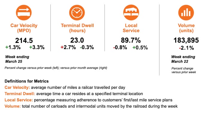 Average car velocity for the week ending March 25, 2025, has increased compared to both the previous week and the previous month, and terminal dwell time has decreased by 0.3% compared to February, BNSF reported on March 28. The Class I’s local service compliance measure, which reflects BNSF’s timeliness in handling freight, remains steady at nearly 90%.