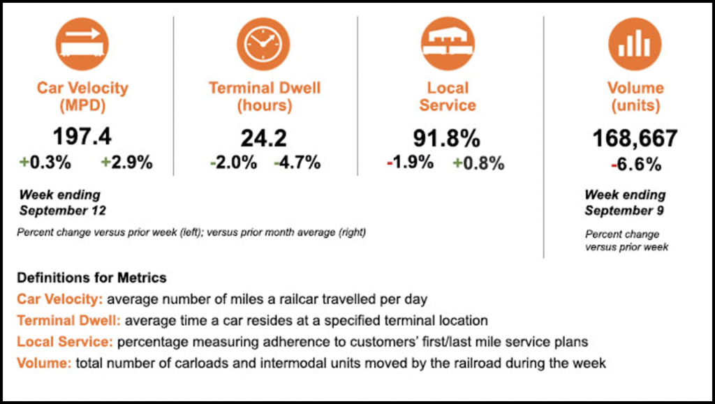 For the first full week of September, BNSF reported experiencing its best railcar velocity in the past 12 months with a weekly average of 197.4 miles per day (see table above). In the most recent two weeks, the railroad had four days where average railcar velocity was above the 200-mile-per-day mark. Additionally, terminal dwell was down, BNSF reported, and is performing better than August 2023. The local service metric, which reflects the railroad’s effectiveness in handling carloads, was down slightly from the prior week but up slightly from the prior month, according to the railroad.
