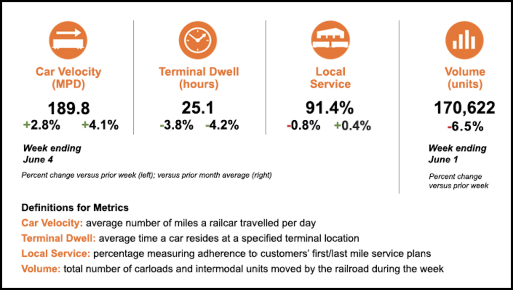 “BNSF operating teams are focused on maintaining positive performance momentum across the network,” the Class I reported in an online operational-performance update for the week ending June 4. “Average car velocity, currently at its highest weekly level this year, increased week-over-week and is over 4% higher than the average for May. Terminal dwell improved by almost 4% compared to the prior week, over 4% from the previous month, and is at the lowest level we have reported this year. Our local service compliance measure, which reflects our timeliness in handling carload freight, exceeds 91%.” The Class I railroad noted that “[w]ith the Memorial Day holiday included for this reporting period, the total volume moved by the railroad was down versus the previous week.”