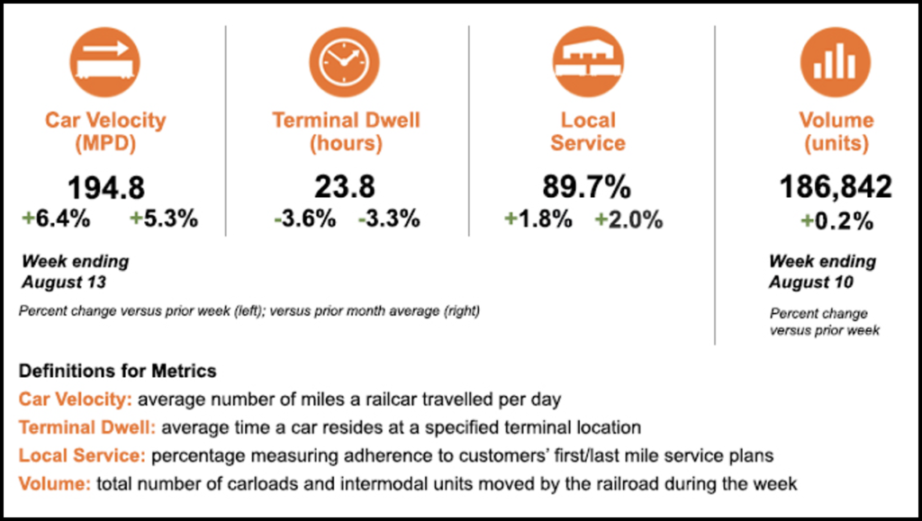 BNSF operating teams are generating “improved performance” and building on “positive momentum,” the Class I reported in an Aug. 16 online customer notification. It said average car velocity has improved “significantly,” by more than 6%, and is running more than 5% higher than the average level reported last month; terminal dwell has decreased from the previous week and is improved from the July average; and the local service compliance measure, which measures efficiency in handling carload freight, has also improved from the previous week and month (see above).