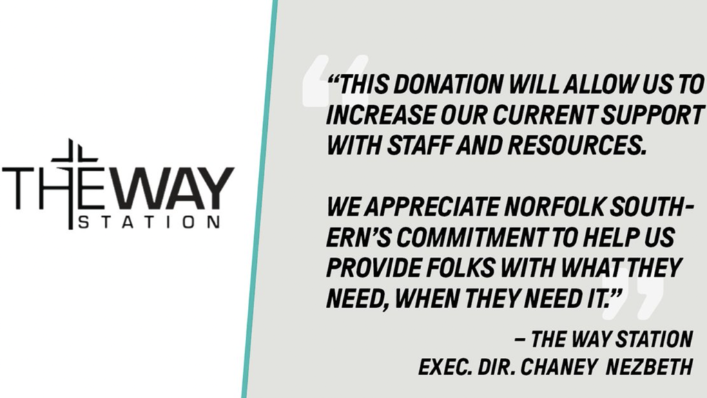 “We know the needs in East Palestine will change over time, and we want to be there to serve this community over the long term,” The Way Station Executive Director Chaney Nezbeth said. “This donation will allow us to increase our current support with staff and resources. We appreciate Norfolk Southern’s commitment to help us provide folks with what they need, when they need it.”