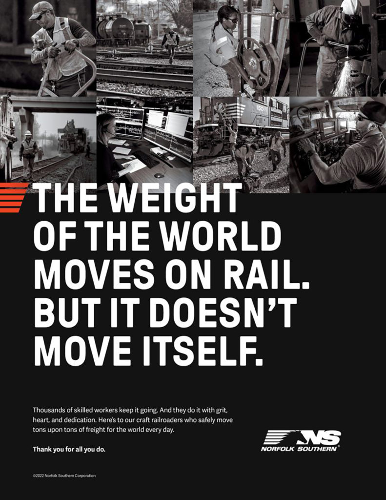 Additionally, NS this week recognized its craft railroaders with a “salute” running in 21 newspapers serving communities around its operations and in the hometowns where many of its employees live (see above).
